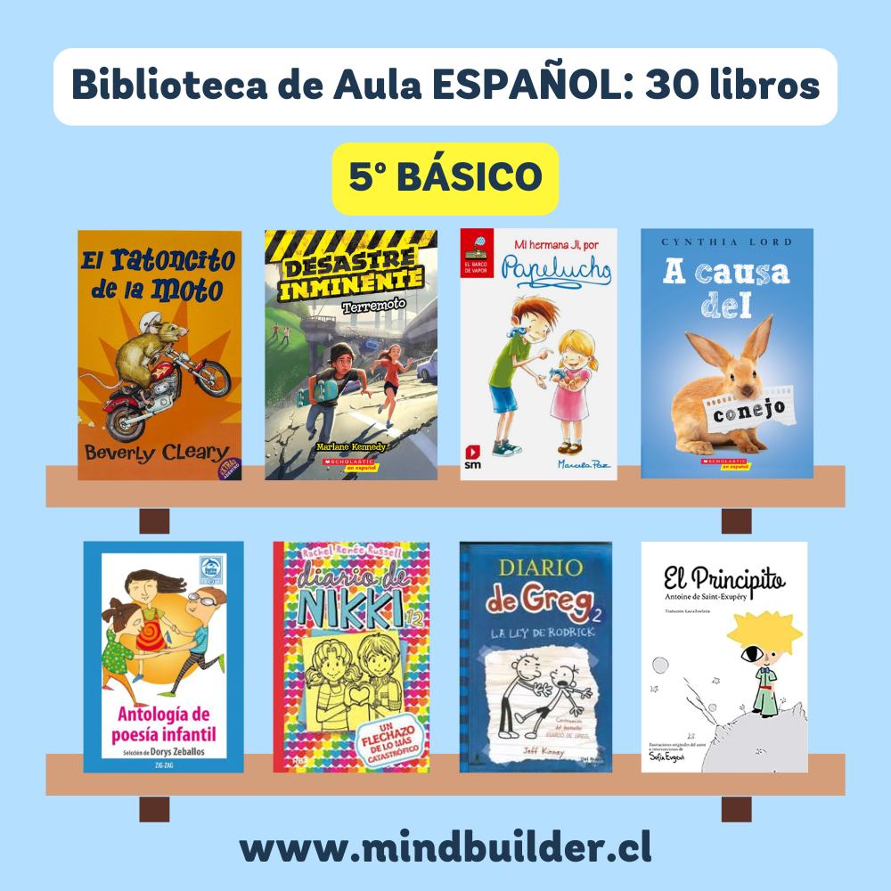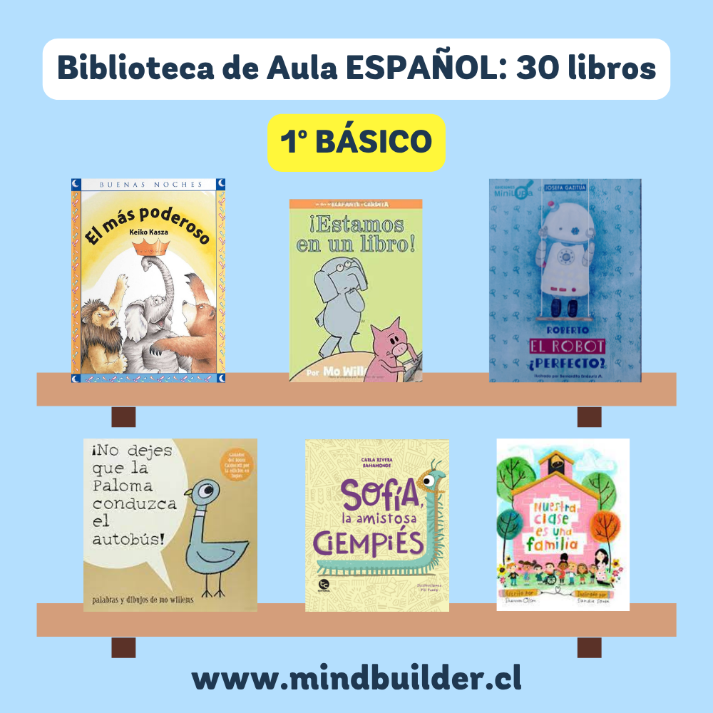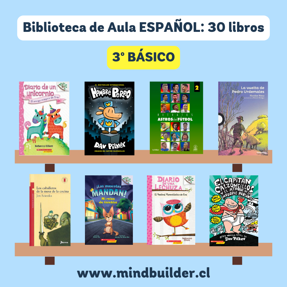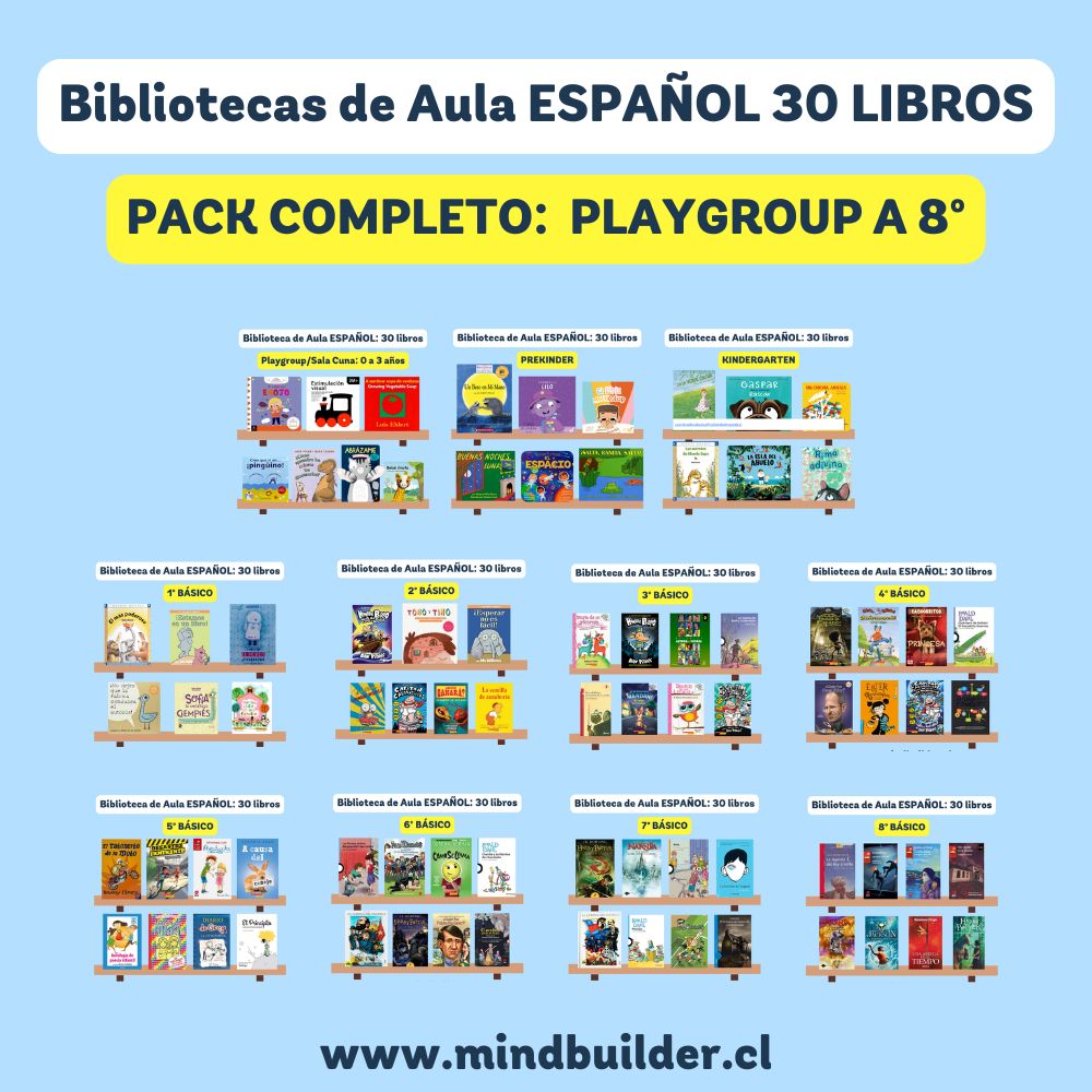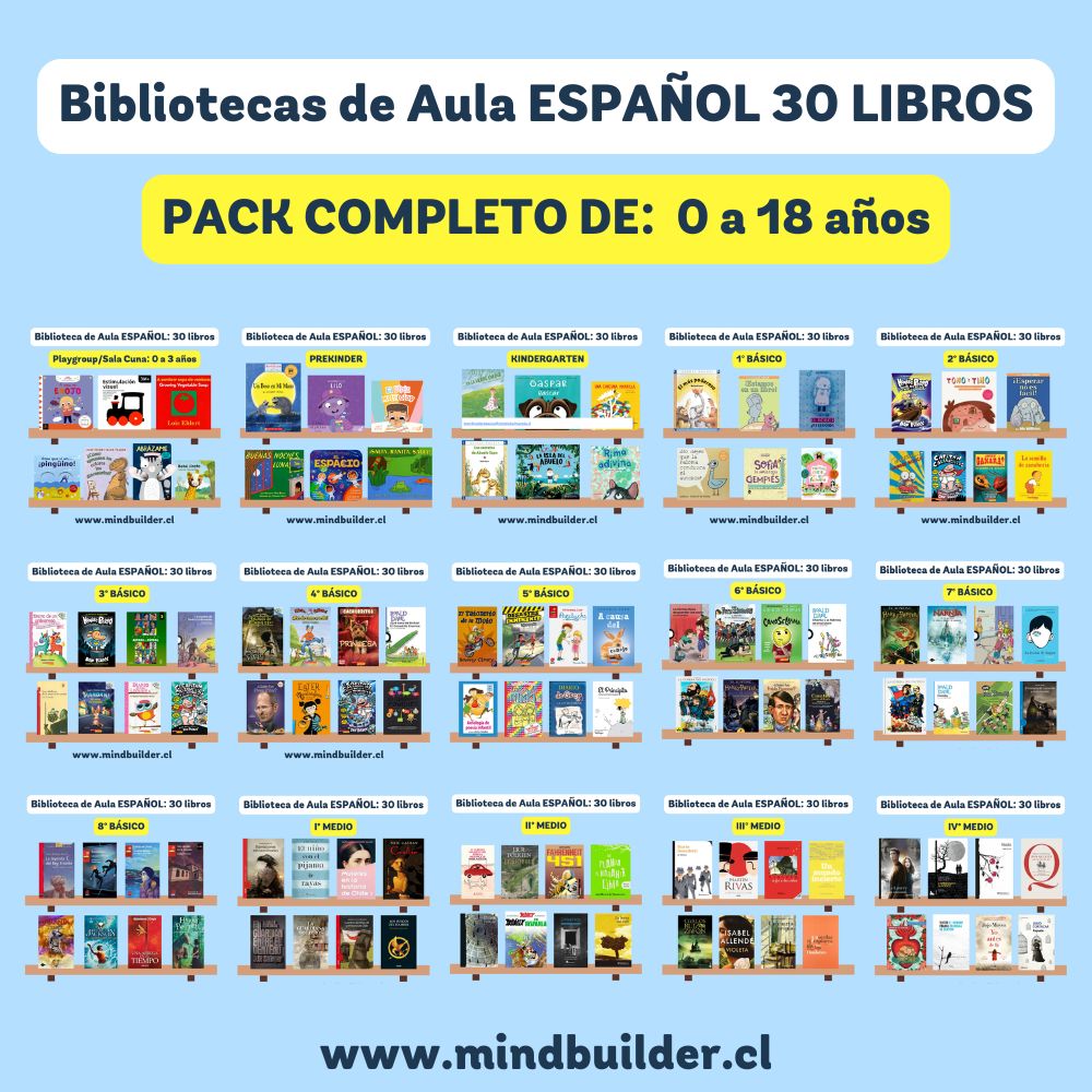 NOTA 1: Las imágenes son referenciales; los títulos pueden variar según stock y requerimientos del establecimiento. NOTA 2: Para preparar una selección personalizada por nivel o proyecto, contáctanos a contacto@mindbuilder.cl NOTA 3: El tiempo de entrega puede variar entre 10 y 30 días hábiles.