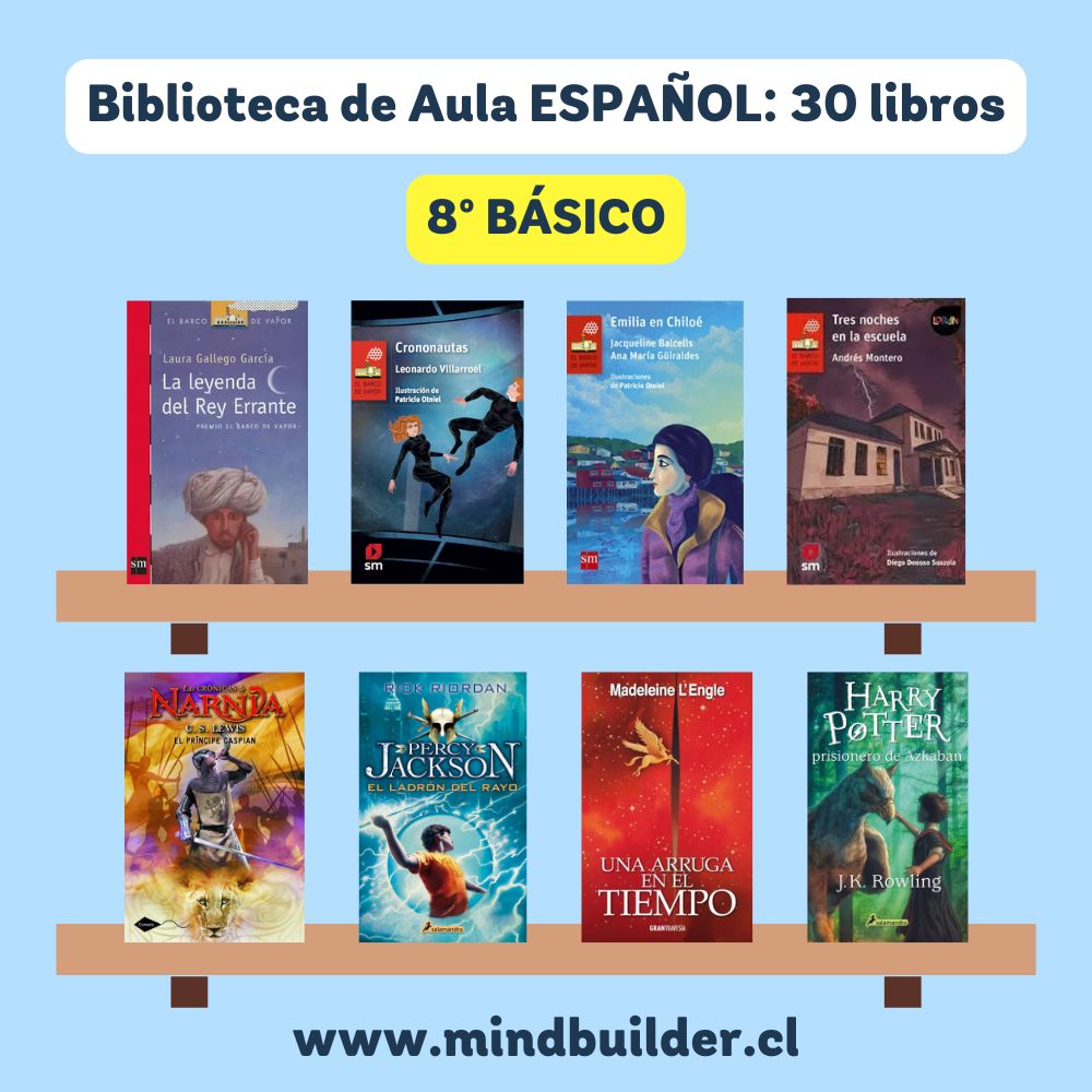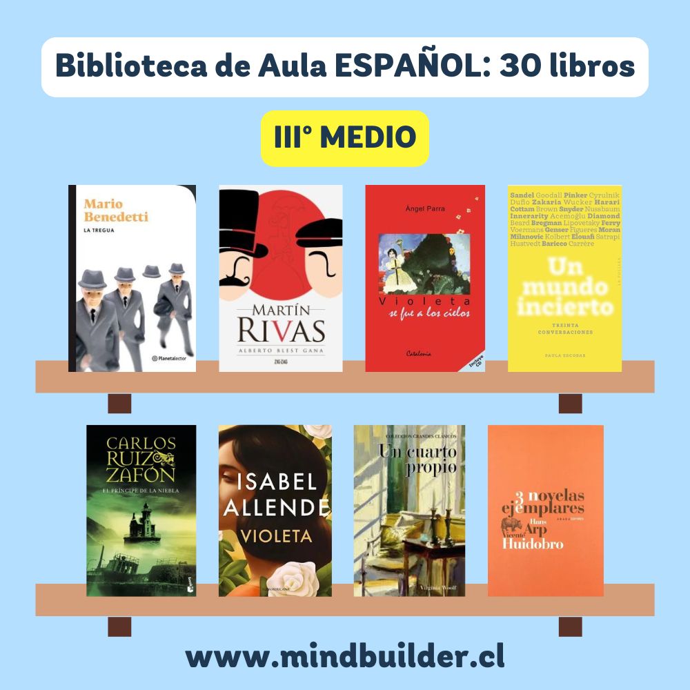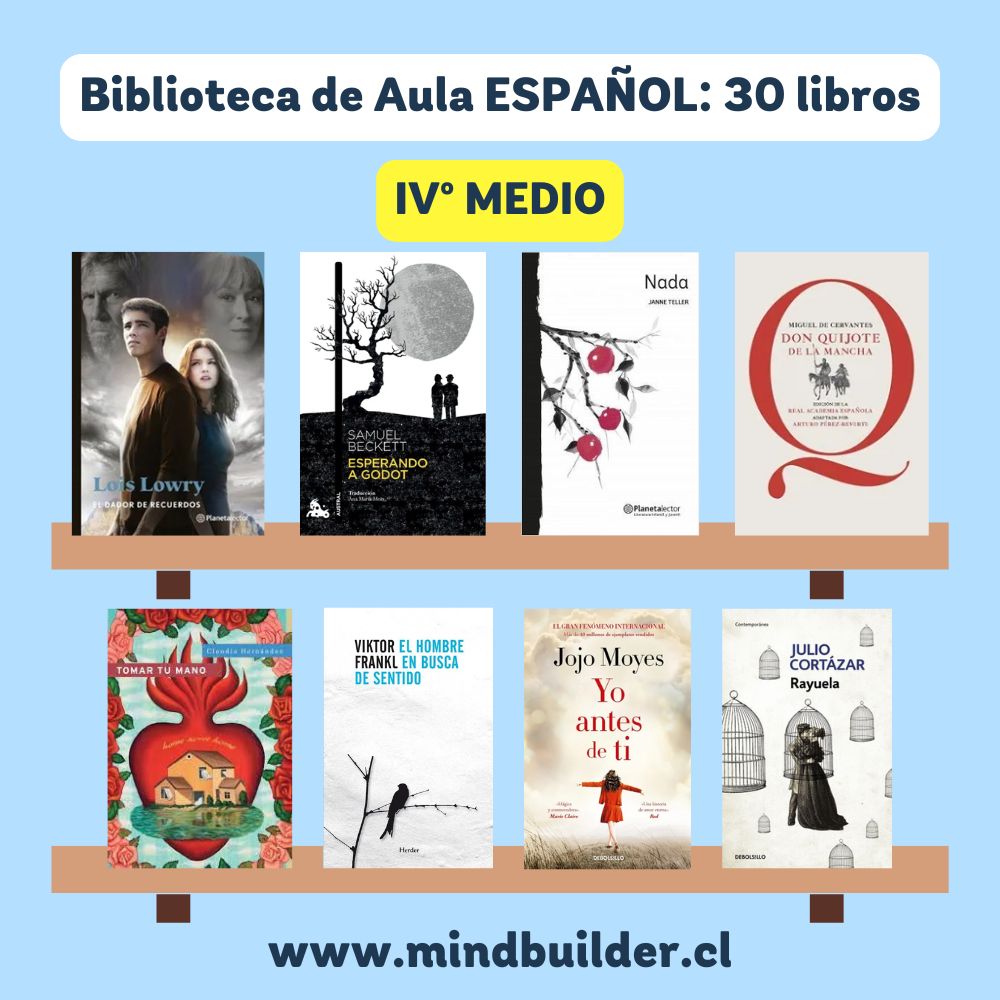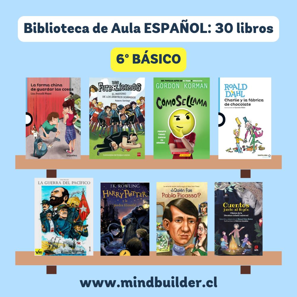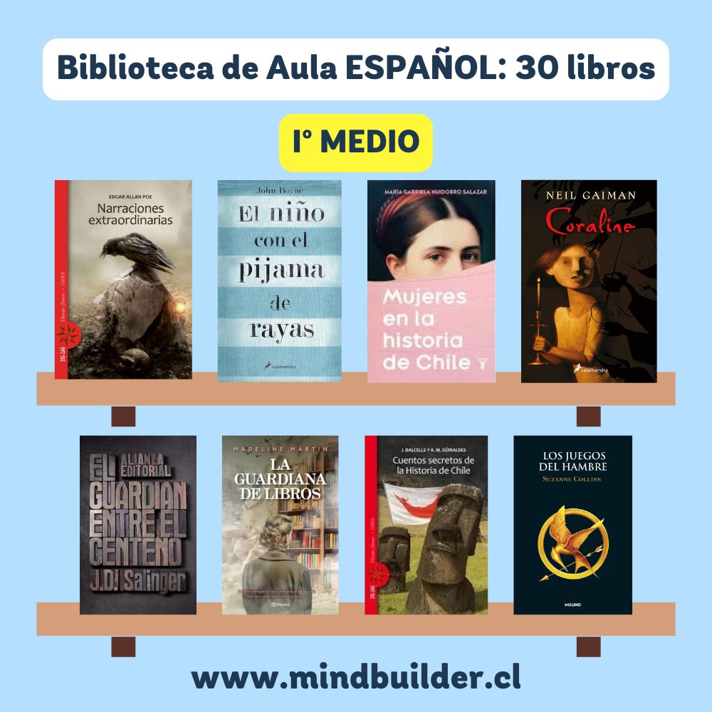 NOTA 1: Imágenes referenciales; los títulos pueden variar según stock y necesidades del establecimiento. NOTA 2: Para preparar un listado personalizado para tu escuela o liceo, contáctanos a contacto@mindbuilder.cl NOTA 3: El tiempo de entrega puede variar entre 10 y 30 días hábiles.