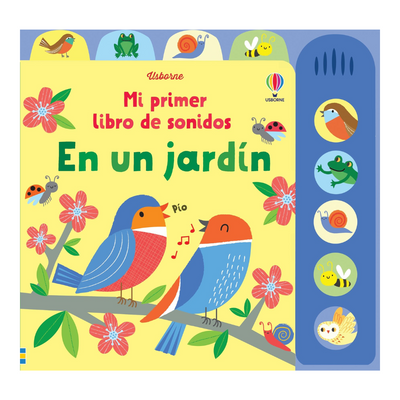Libro interactivo con un panel lateral de botones para escuchar los sonidos de un jardín. El cantar de los pájaros, el ruido de la lluvia, el zumbido de las abejas, el croar de las ranas o el ulular de los búhos. Las llamativas ilustraciones llenas de color son perfectas para bebés y niños pequeños.